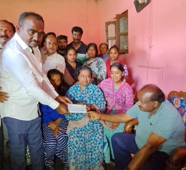 ರಾಮನಗರ: ಚಲಿಸುತ್ತಿದ್ದ ಕಾರಿನ ಮೇಲೆ ಆಲದ ಮರ ಉರುಳಿಬಿದ್ದು ದುರ್ಮರಣಕ್ಕೀಡಾದ ಬಿಡದಿಯ ಇಟ್ಟಮಡು ಬೋರೆಗೌಡರ ಕುಟುಂಬಕ್ಕೆ ಮಾಜಿ ಸಿಎಂ ಹೆಚ್.ಡಿ.ಕುಮಾರಸ್ವಾಮಿ ಸಾಂತ್ವನ ಹೇಳಿ, 5 ಲಕ್ಷ ರೂ ಪರಿಹಾರದ ಚೆಕ್ ವಿತರಿಸಿದರು.