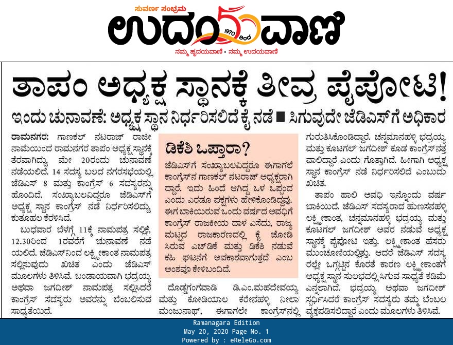 ರಾಮನಗರ ತಾಲೂಕು ಪಂಚಾಯ್ತಿ ಅಧ್ಯಕ್ಷ ಸ್ಥಾನಕ್ಕೆ ಮೇ ೨೦ ರಂದು ಚುನಾವಣೆ