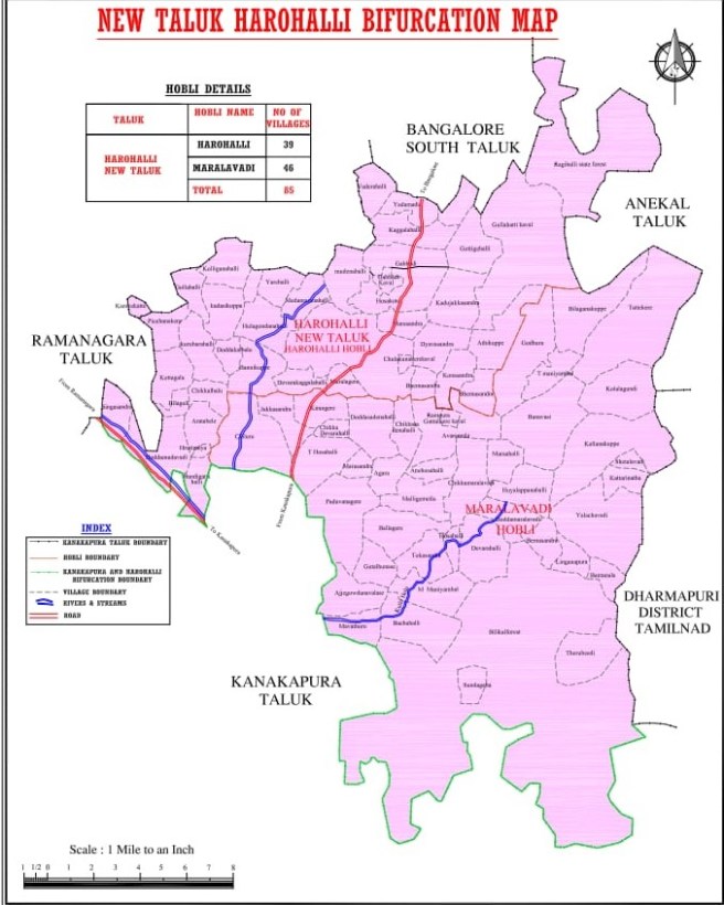 ಹಾರೋಹಳ್ಳಿಯ 11 ವೃತ್ತಗಳ 107 ಗ್ರಾಮಗಳು ಮತ್ತು ಮರಳವಾಡಿ ಹೋಬಳಿಯ 15 ವೃತ್ತಗಳ 145 ಗ್ರಾಮಗಳು ಒಟ್ಟು 26 ಕಂದಾಯ ವೃತ್ತಗಳ 252 ಗ್ರಾಮಗಳನ್ನು ನೂತನ ತಾಲೂಕಿಗೆ ಸೇರ್ಪಡೆಯಾಗಲಿವೆ. ಹಾರೋಹಳ್ಳಿ ತಾಲೂಕಿನ ಗಡಿಯಲ್ಲಿ ಪೂರ್ವಕ್ಕೆ ತಮಿಳುನಾಡಿನ ಧರ್ಮಪುರಿ ಜಿಲ್ಲೆ, ಪಶ್ವಿಮಕ್ಕೆ ರಾಮನಗರ ತಾಲೂಕು, ಉತ್ತರಕ್ಕೆ ಬೆಂಗಳೂರು ದಕ್ಷಿಣ ತಾಲೂಕು ಮತ್ತು ಆನೇಕಲ್ ತಾಲೂಕುಗಳ ಗಡಿ ಹಾಗೂ ದಕ್ಷಿಣದಲ್ಲಿ ಕನಕಪುರ ತಾಲೂಕಿನ ಗಡಿ ಇರಲಿದೆ.